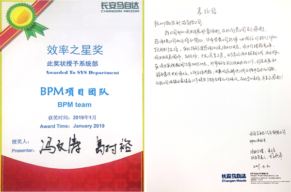 2018年9月10日,“長安馬自達全新業務流程管理BPMA系統”項目正式啟動,僅耗時88天就成功上線,成為了長安馬自達打響雙效提升工作的一大利器。為此長安馬自達多次致信,對項目團隊及項目成果表達了高度贊揚與認同。