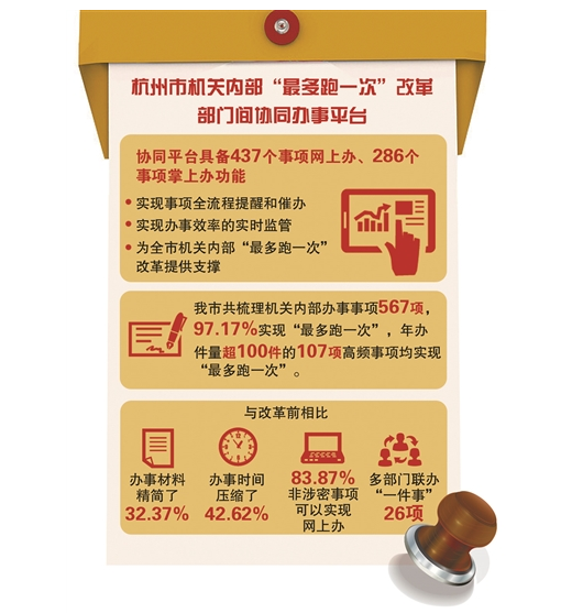 近年來(lái),機(jī)關(guān)內(nèi)部部門(mén)之間一直存在著多次跑、多頭跑、環(huán)節(jié)多、時(shí)間長(zhǎng)、簽字煩等制約機(jī)關(guān)內(nèi)部辦公效能的突出問(wèn)題。為提高機(jī)關(guān)內(nèi)部辦事效率,杭州市政府正式立項(xiàng)啟動(dòng)了機(jī)關(guān)內(nèi)部“最多跑一次”的改革創(chuàng)新。通過(guò)全面梳理機(jī)關(guān)內(nèi)部各類(lèi)辦事事項(xiàng),明確每一個(gè)事項(xiàng)的辦理時(shí)間、辦理流程,積極推進(jìn)“網(wǎng)上辦、掌上辦”,使每一項(xiàng)工作都能全程自動(dòng)留痕、每一位干部都能精準(zhǔn)評(píng)價(jià),確保各項(xiàng)工作、各項(xiàng)改革落到實(shí)處。